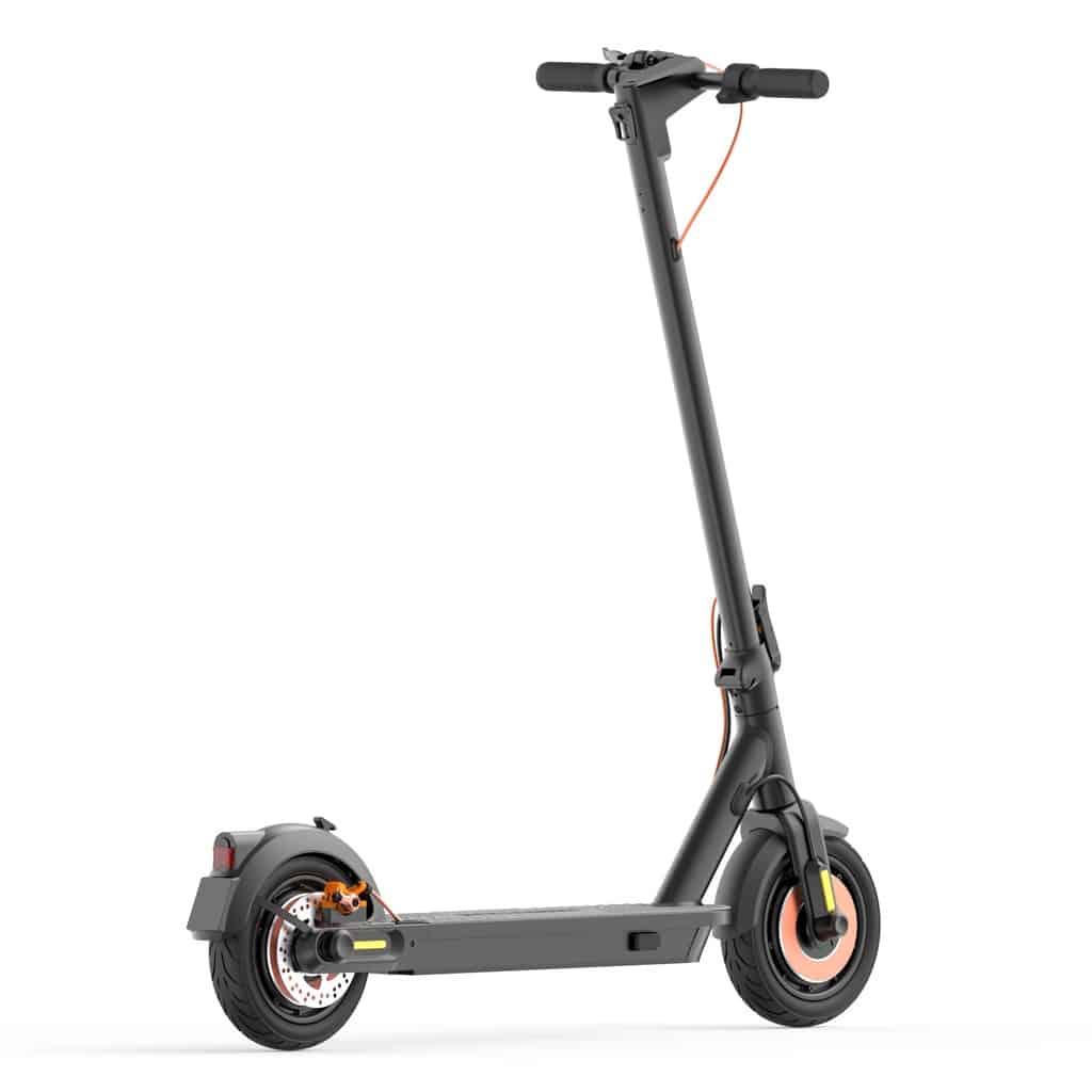 Si elle ne propose pas d’amortisseur, le confort repose sur la présence de deux grandes roues gonflables en 10 pouces. De grandes roues pour assurer l’amorti sur les voies même accidentées. Une conduite souple, la taille du deck et la hauteur du guidon sont idéales pour une position de conduite confortable. On a toute la place nécessaire pour y mettre les pieds.